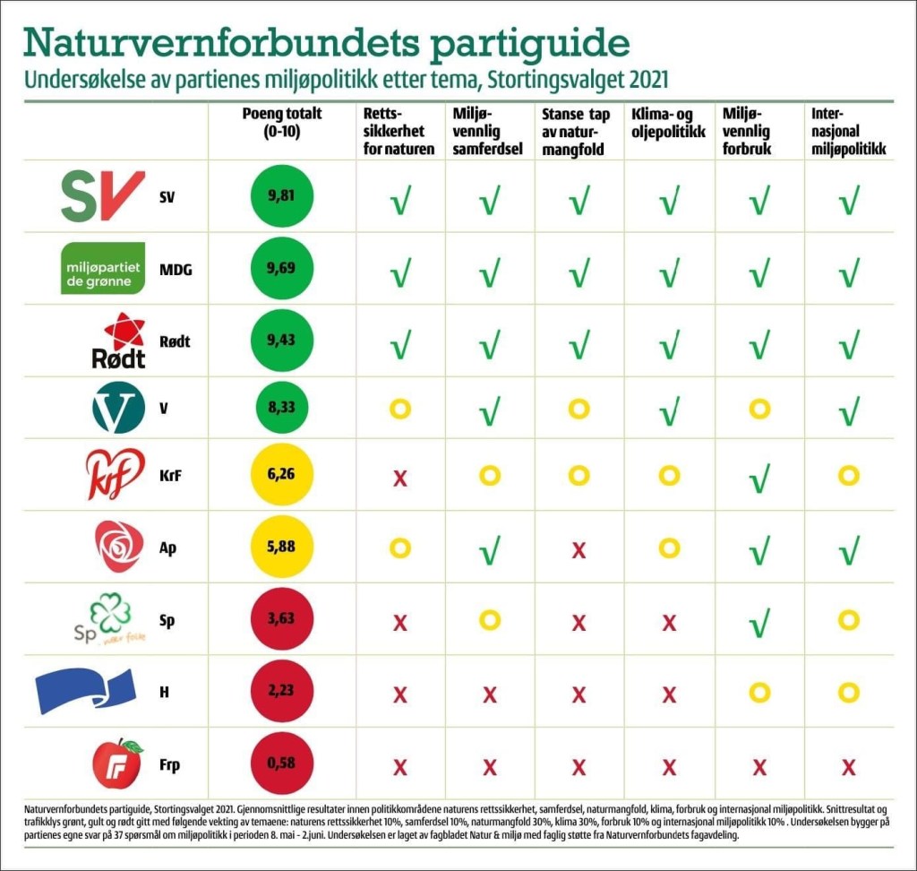 Naturvernforbundet har presentert ei brei vurdering av politikken til partia. Den dekkjer område som naturmangfald, forbruk, samferdsel og klima. Her kjem SV best ut følgt av MDG, Raudt og Venstre. Desse partia får grønt lys av Naturvernforbundet. Deretter kjem KrF og AP som får gult lys. Nedst på lista finn vi SP, Høgre og Frp som får raudt lys av miljøorganisasjonen. Gjennomgangen er detaljert og har mange interessante poeng. Du kan finne heile oversikten på nettsidene til Naturvernforbundet.